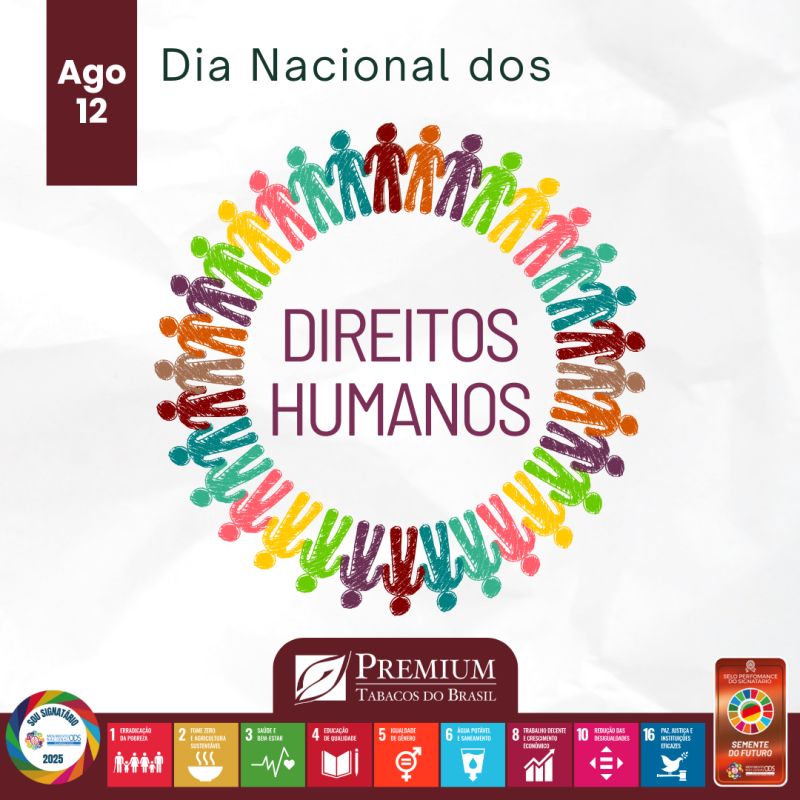 Neste 12 de agosto, celebramos o Dia Nacional dos Direitos Humanos, uma data essencial para reafirmarmos nosso compromisso com os princípios que sustentam uma sociedade justa, igualitária e respeitosa. Na Premium Tabacos do Brasil, acreditamos que os Direitos Humanos são a base da dignidade de cada indivíduo. Por isso, renovamos nosso compromisso com a liberdade, igualdade e respeito a todas as pessoas, sem qualquer distinção. Esses valores estão presentes em nossa cultura e se refletem em nossas políticas de inclusão, diversidade e no cuidado com nossos colaboradores, bem como com as comunidades onde atuamos. Neste dia, reforçamos nossa responsabilidade de construir um ambiente de trabalho e uma sociedade em que a dignidade humana seja sempre prioridade